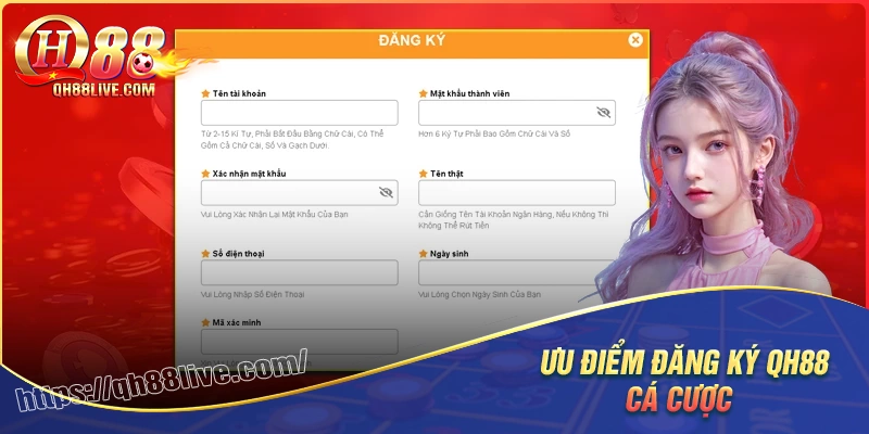 Khi đăng ký bạn cần cung cấp các thông tin cá nhân chính xác và chính chủ bao gồm họ tên, số điện thoại, địa chỉ email và số tài khoản ngân hàng. Việc xác minh danh tính là một bước bắt buộc để QH88 có thể bảo vệ quyền lợi hợp pháp của bạn đồng thời ngăn chặn các rủi ro phát sinh trong quá trình giao dịch nạp/rút tiền.